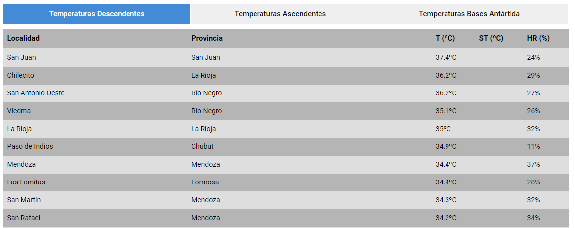 Con las agujas marcando las 15, la temperatura fue en ascenso y el calor ya imperaba en plena siesta sanjuanina con 36.6°C. Pero a las 16, la capital de San Juan se ubicó primera en el ranking con 37.4°C, segundas se ubicaron las ciudades Chilecito de La Rioja y San Antonio de Río Negro con 36.2°C y completó el podio Viedma de Río Negro con 35.1°C.