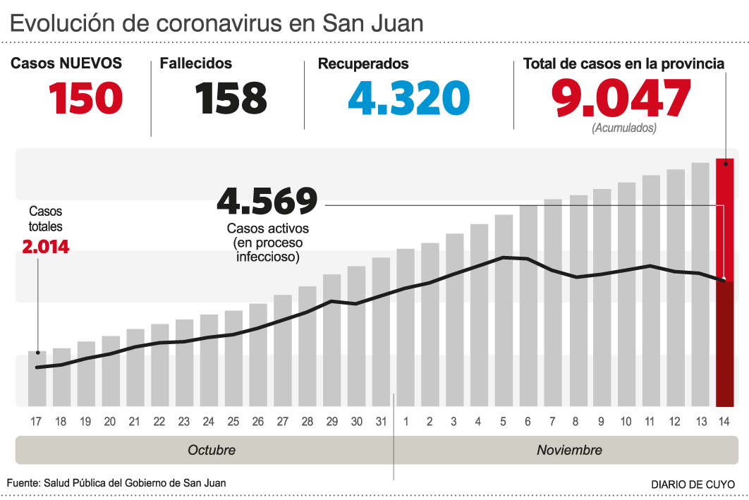 A principios de abril, días después de que lo anunciara este diario, el Ministerio de Salud Pública advirtió que la peor proyección en pandemia para San Juan involucraba a 40.000 personas en "contacto con el virus". Un número que por entonces parecía inalcanzable, pero a más de 200 días de aquel anuncio, ya no parece lejano. De hecho, con más de 9.000 casos confirmados la provincia llegó casi al 25% de aquella estimación y eso sin tener en cuenta los positivos por criterio epidemiológico, es decir, los convivientes, de los que no hay cifras oficiales.