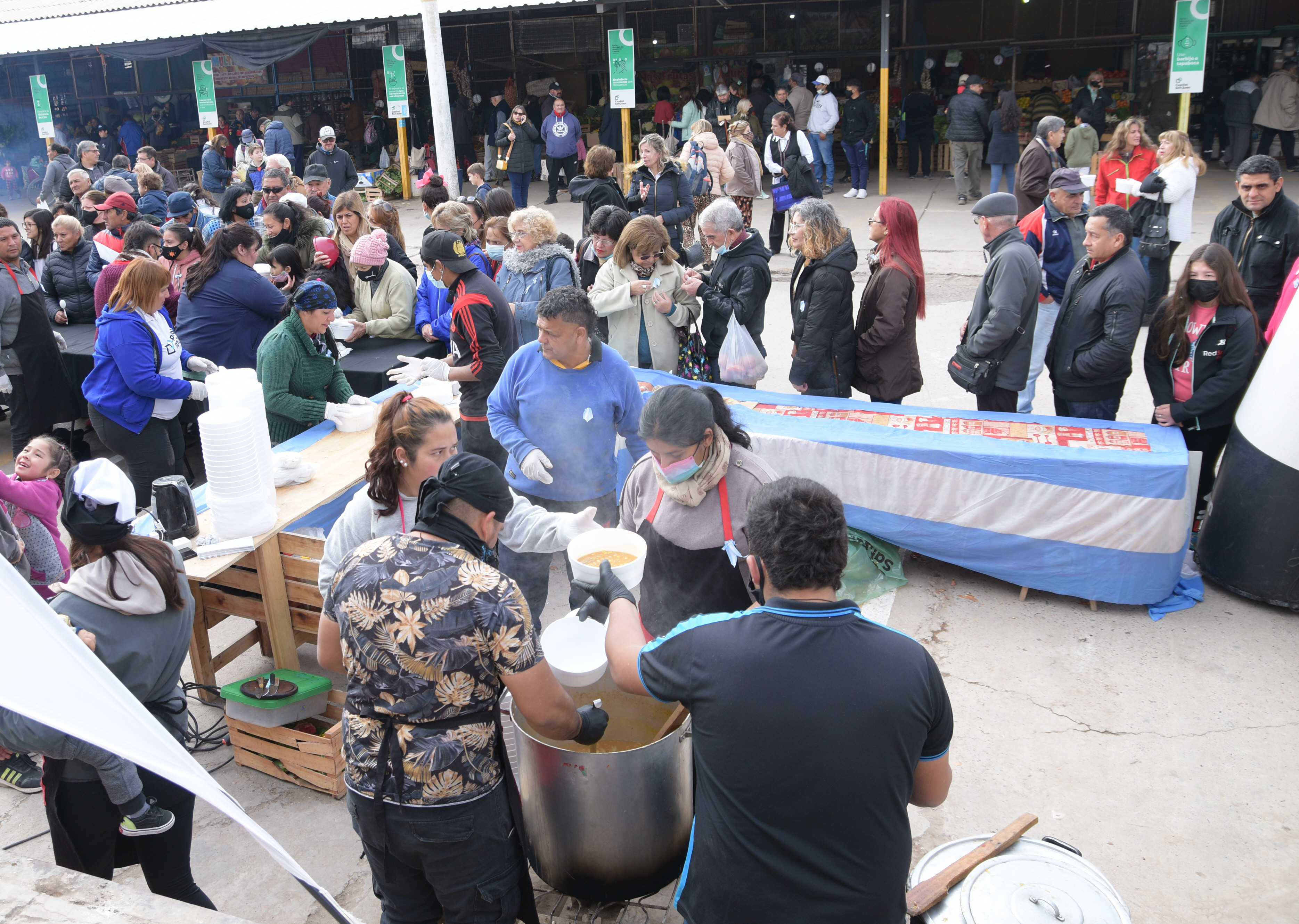 Mientras los puesteros de la feria vendían verduras y frutas, la música de fondo hizo que la jornada fuera más amena y que los clientes también disfrutaran de una mañana en la que el sol le puso un toquecito de calor. Y no sólo eso, el mate cocido caliente y hasta el olor al locro que ya empezaba a hacerse sentir volvieron más interesante esta atípica jornada. "Venimos todos los sábados y hoy es un día totalmente diferente. Se disfruta hacer las compras de esta manera", dijo Ricardo Ruarte, un sanjuanino que es un fiel cliente del Mercado de Abasto. Al igual que él, otras personas que fueron a comprar y hasta los mismos chacareros disfrutaron de esta jornada que fue de menor a mayor y que tuvo su punto culmine con la entrega de 250 porciones de locro. El locro fue realizado por un grupo de referentes de merenderos y comedores que reciben apoyo constante de los puesteros de la feria. "Lo hicimos para dar las gracias porque ellos nos ayudan a diario con verduras para que nosotros alimentemos a cientos de niños", dijo Daniel Cardozo, uno de los encargados de cocinar este plato.