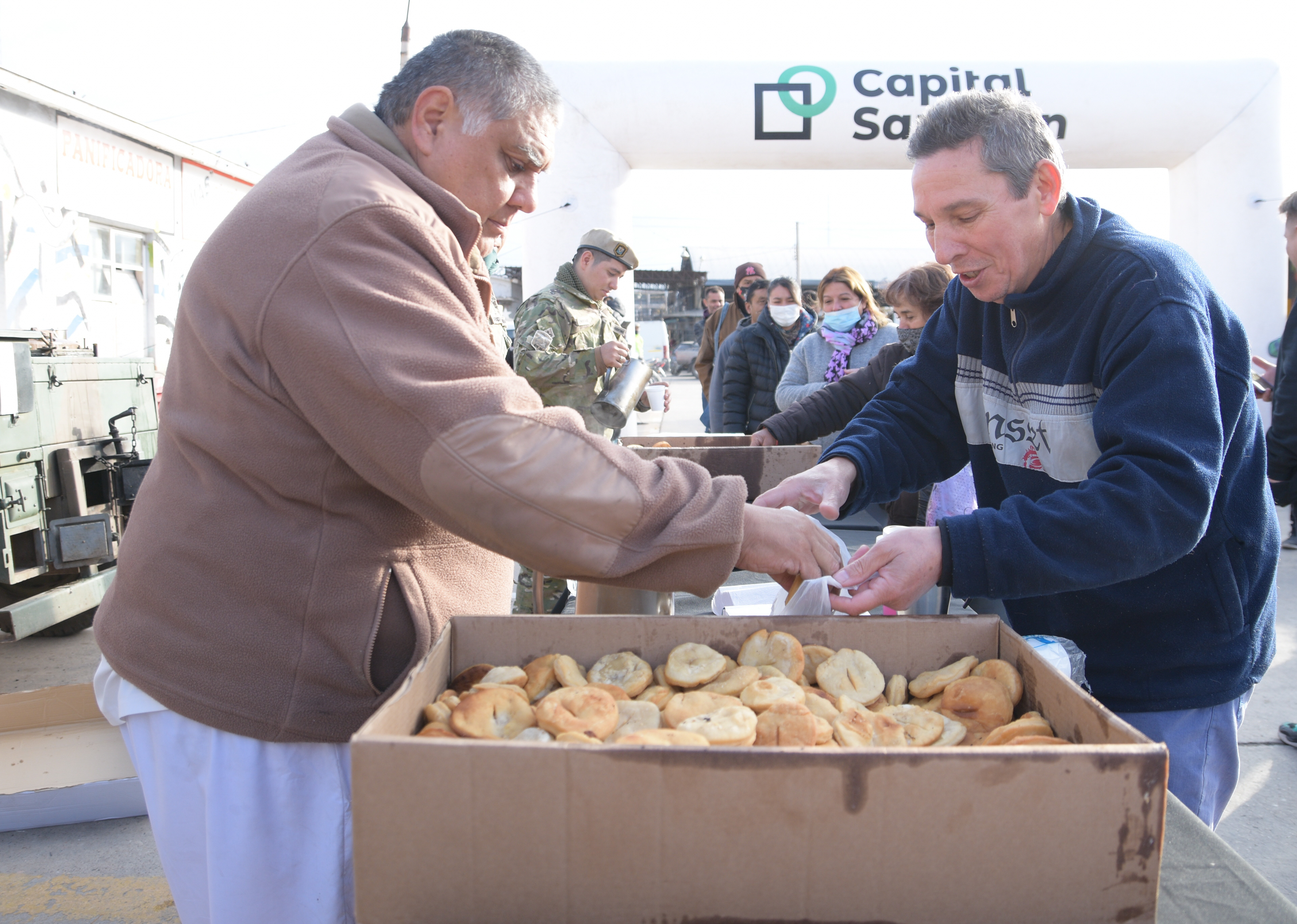 Ayer, a primera hora de la mañana, integrantes del Ejército entregaron sopaipillas calientes y mate cocido. La gente hizo fila durante varios minutos para recibir ese desayuno. Algunos incluso repitieron sus porciones. Todo fue gratuito.