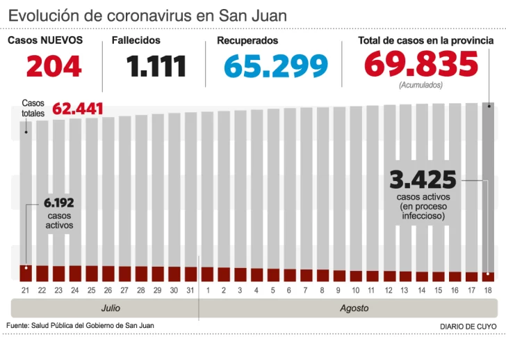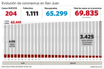 Por otro lado, luego de poco más de 1.500 testeos en toda la provincia, las autoridades sanitarias reportaron 204 nuevos casos, por lo tanto el total de confirmados asciende a 69.835 infectados a lo largo de todo el proceso pandémico.