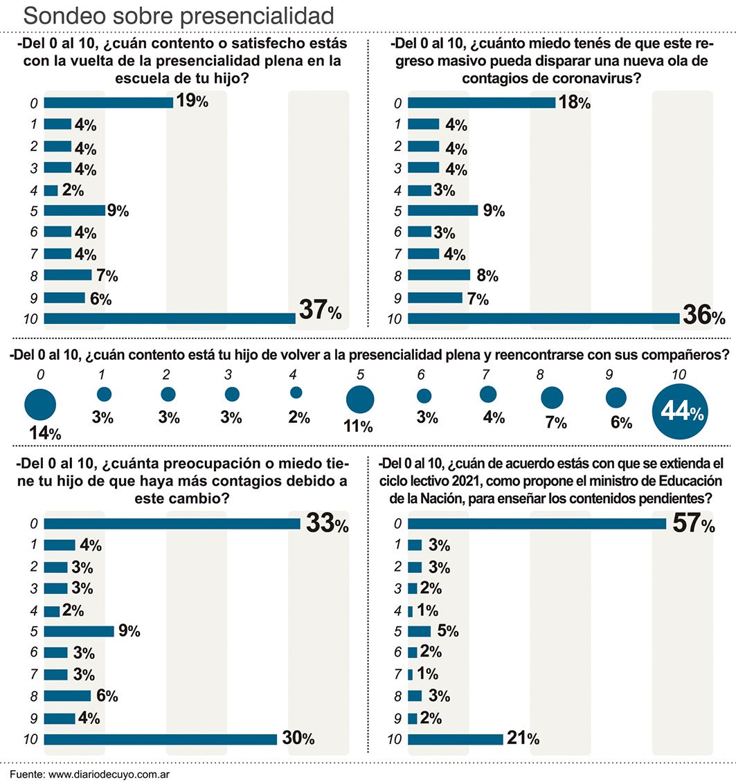 En la encuesta que este medio realizó a través de su página web, los padres midieron su felicidad y la de sus hijos por la presencialidad plena y el miedo que esto les genera a los adultos y a los niños. Durante la consulta, los encuestados mostraron una clara decisión a la hora de responder las preguntas en las que debían calificar, del 0 al 10, algún sentimiento propio o de sus hijos. De hecho, los porcentajes más elevados siempre estuvieron en alguno de los extremos de los puntajes (ver infografía). Es decir, en el 0 o en el 10. De esta encuesta participaron casi 1.000 lectores de DIARIO DE CUYO.