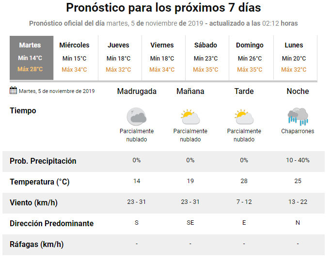 Para la tarde se espera una máxima de 28 grados, con viento desde el Este a razón de entre 7 y 12 kilómetros por hora. Y para la noche, se anuncia probables chaparrones.