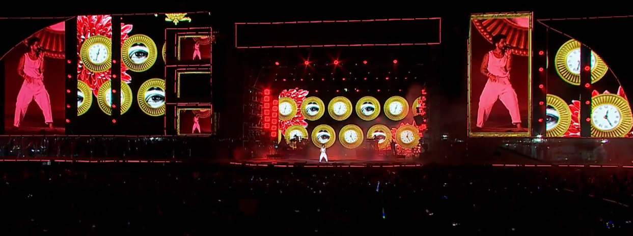 El intérprete de hits como ‘Vida de rico’, ‘Tutu’, ‘Desconocidos’ y ‘La boca’ fue desplegando su repertorio y la devolución de la gente, no paraba de crecer. El artista mostró también su poder de convocatoria en la amplitud de las edades del público. Niños y adultos coreaban los estribillos mientras miles de pantallas grababan el momento personal de ser testigos del espectáculo, mezclados con carteles donde se manifestaba el amor por el cantante del particular bigote.