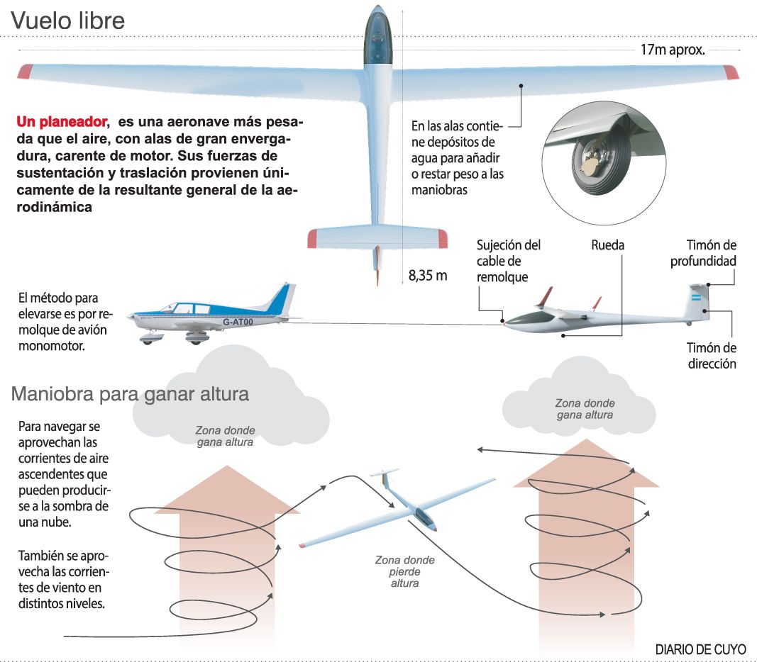 El vuelo a vela es una disciplina que se basa en la capacidad de mantenerse volando en un velero o planeador, en el que los pilotos aprovechan la aerodinámica del avión y las corrientes ascendentes de aire que se generan en la atmósfera. Como los veleros no tienen motor, deben ser remolcados por una avioneta hasta una cierta altura, que suele ser unos 500 metros, y tras soltarse los planeadores quedan libres (ver infografía). Los pilotos, en tanto, controlan sus desplazamientos y los aterrizan contando con su propia habilidad y los recursos atmosféricos, explicaron.
