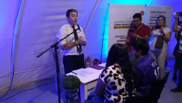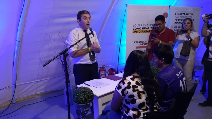 Natalia Irrazabal (18) y Carlos Gutiérrez (19) decidieron sellar el amor que tiene desde hace cuatro años de una manera por demás original. Por eso completaron la solicitud en el stand del Registro Civil y, con el ministro de Gobierno Alberto Hensel como testigo, oficializaron su casamiento ante la mirada de decenas de personas.