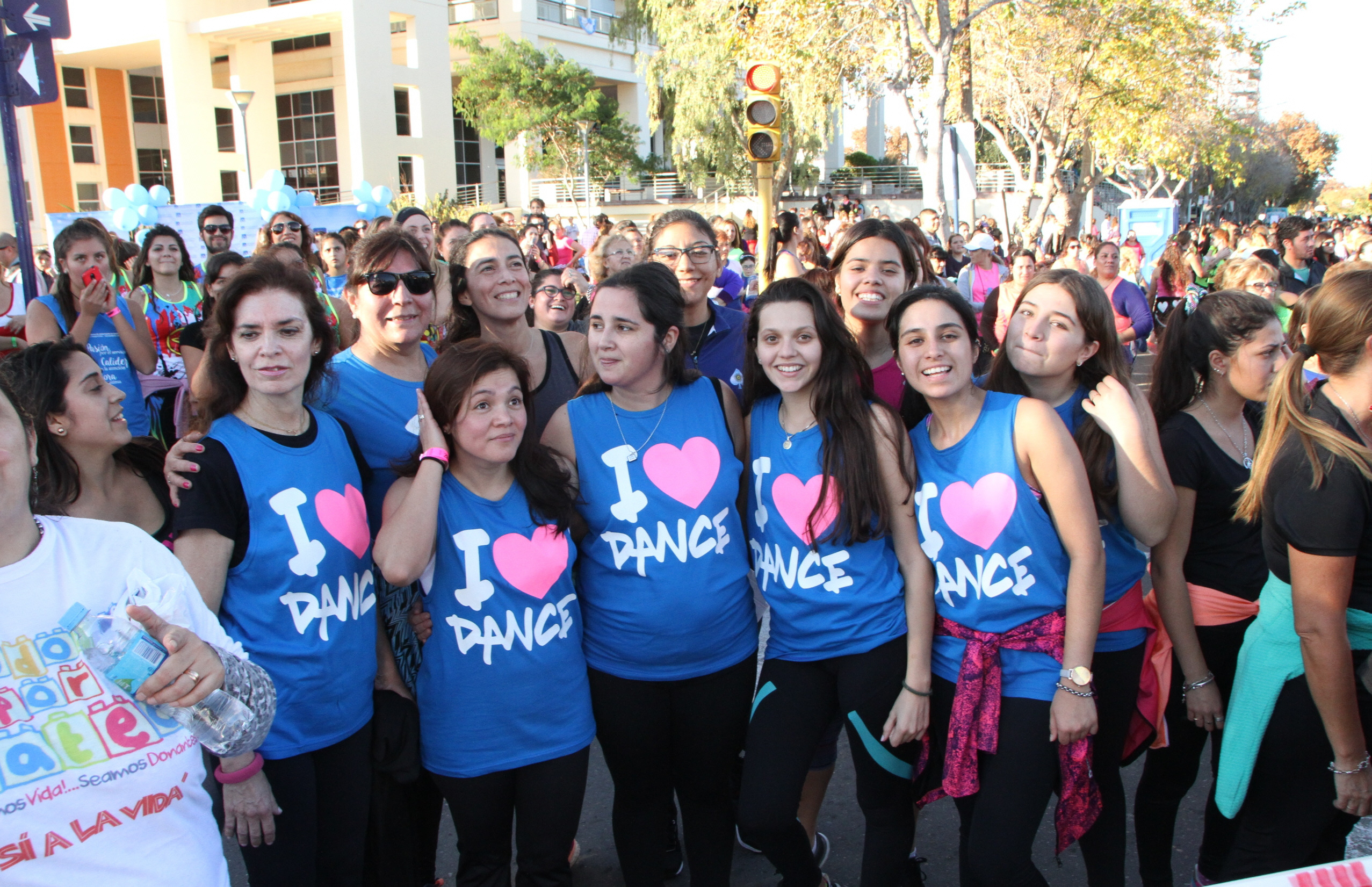 Son 10 compañeras del instituto Allegro, en Rivadavia, que decidieron acompañar a la profe, Antonella Flores, una de los 36 instructores que estuvieron dirigiendo la súper clase de zumba. Fue uno de los tantos grupos que se presentó con una indumentaria que las identificaba. “Zumba es nuestro cable a tierra”, afirmaron Natalia y Cecilia.