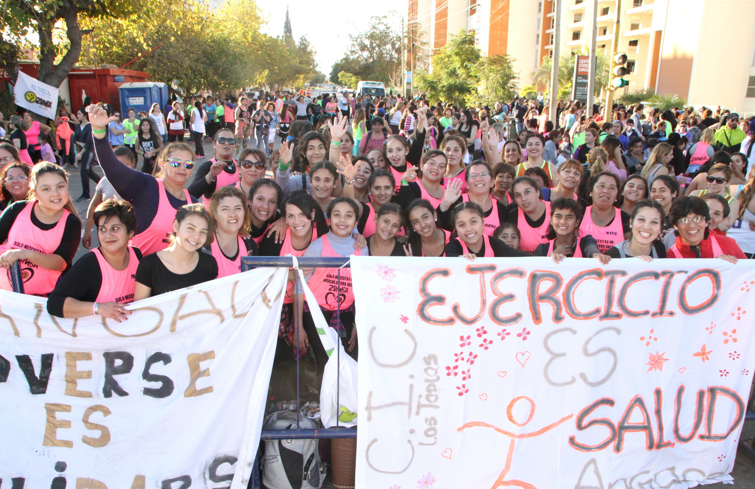 Unas 50 angaqueras se pusieron bien al frente de la clase, en el ala norte de la calle Las Heras. Con una musculosa rosa con la inscripción “Sólo necesitas un músculo para hacer zumba”, llevaban el ritmo a la par de la profe, Emilse Oliva, quien anima al divertido grupo desde octubre del año pasado.