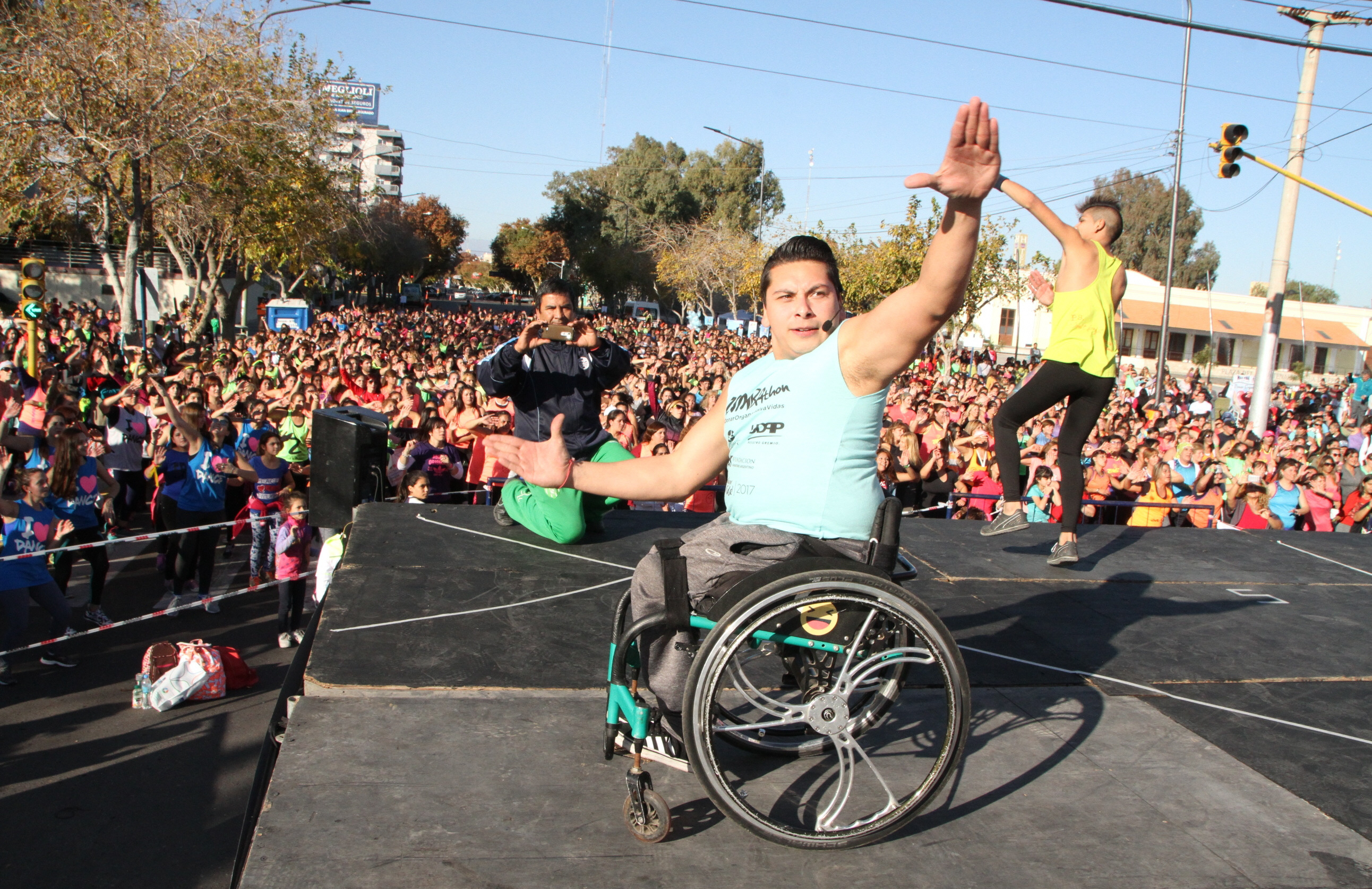 El chileno Guillermo Aránguiz tiene 29 años y llegó a San Juan para ser uno de los tantos instructores que animaron la gran fiesta de zumba en Central y Las Heras. Debido a que nació con espina bífida es que se traslada en silla de ruedas, pero eso no impide que tenga una vida muy activa y se convirtiera ayer en ejemplo de superación.
