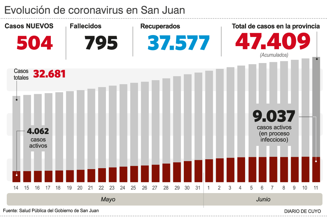 El parte de Salud Pública provincial dio cuenta ayer de una leve baja en los casos positivos y en la cantidad de personas fallecidas. De acuerdo al reporte, ayer murieron 6 sanjuaninos, entre los cuales se encuentra un hombre de 46 años, de 25 de Mayo. De esta manera, el total de decesos en la provincia es de 795. En cuanto a los casos, ayer fueron reportados 504 contagios y con ellos, el acumulado ahora es de 47.409 infectados a lo largo de toda la pandemia. Los casos activos son 9.037 y los internados en áreas covid son 277, de los cuales 132 permanecen internados en terapia intensiva (59 se encuentran con asistencia respiratoria mecánica). La ocupación de camas críticas es de 86,3%.