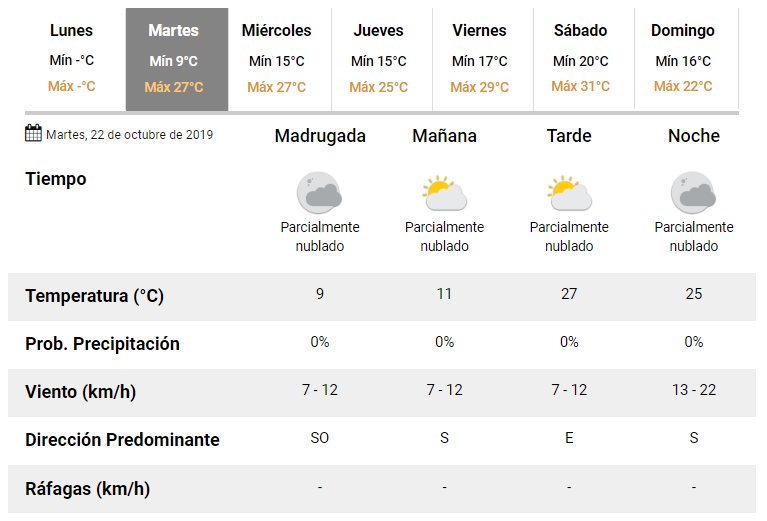 La jornada se presentará con cielo parcialmente nublado y viento de diferentes direcciones, comenzando del sudoeste, girando al sur, cambiando al este por la tarde y regresando al sur por la noche.