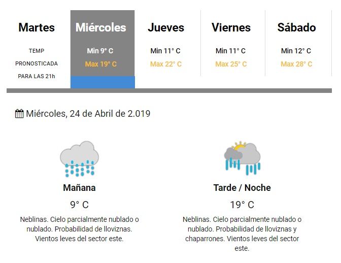 Se prevé probabilidad de lloviznas y vientos leves del sector este.