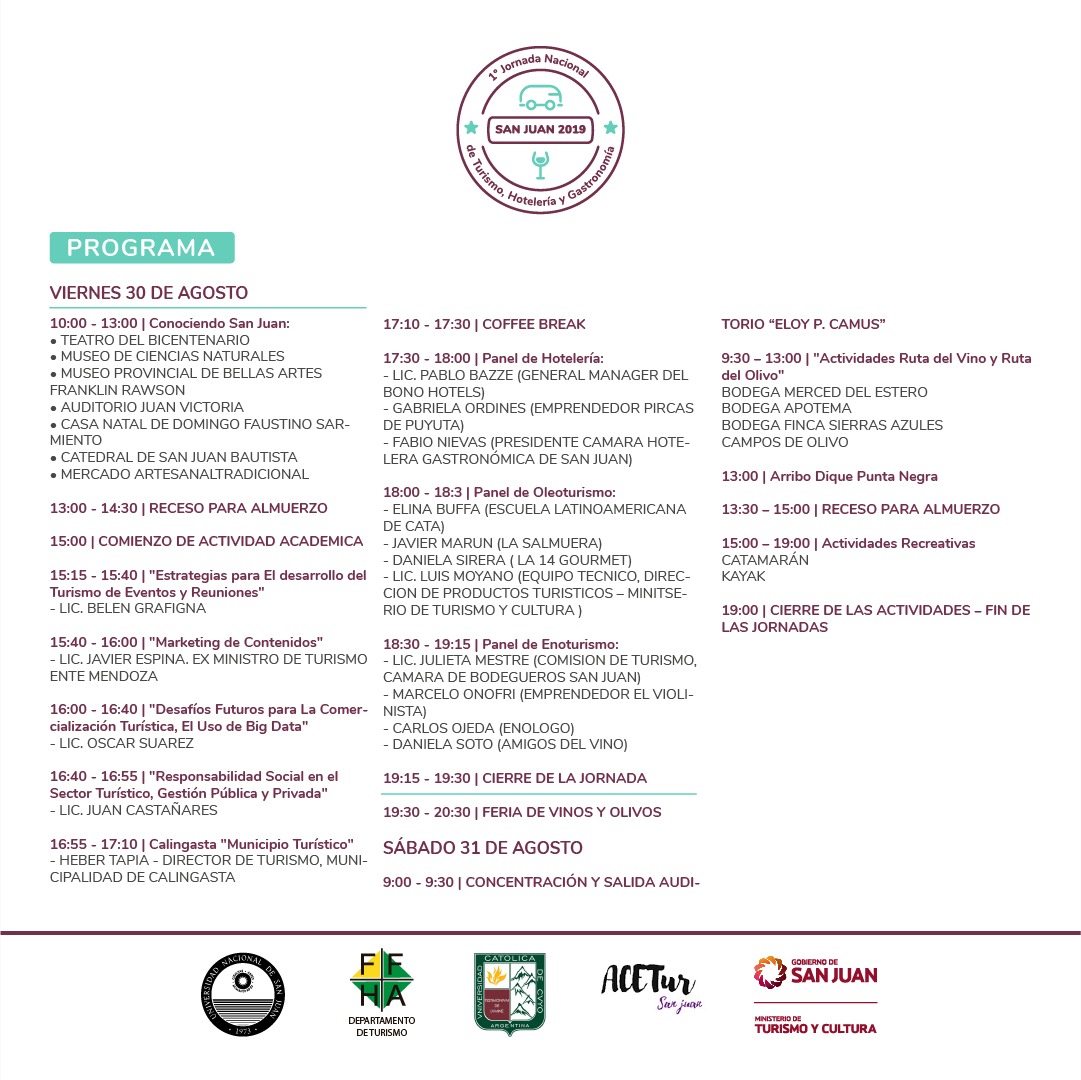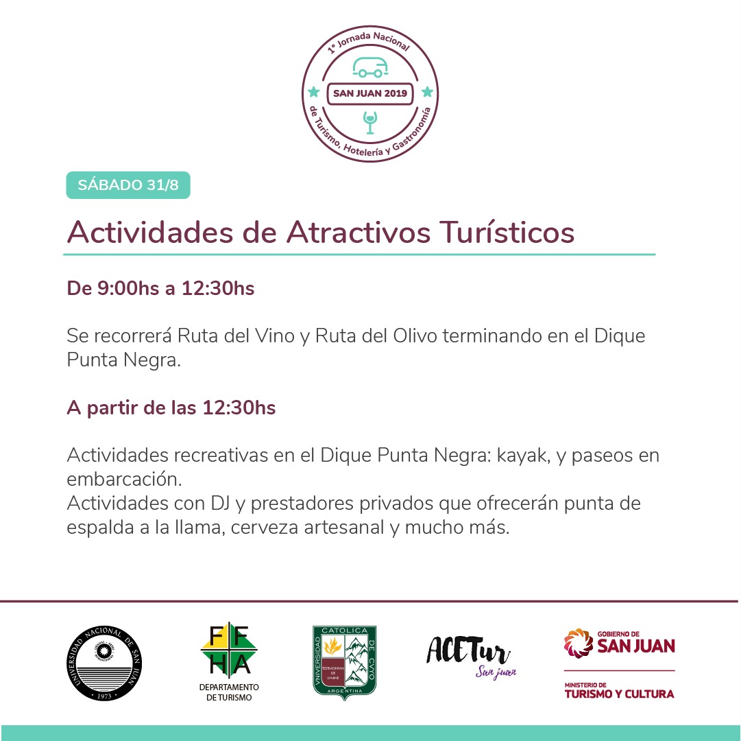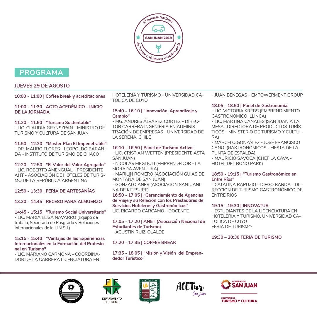 Desde este jueves 29 de agosto San Juan vivirá la 1º Jornada Nacional de Turismo, Hotelería y Gastronomía. En el Salón Auditorio Eloy Camus, el encuentro que reunirá a participantes de todo el país comenzará a las 10 de la mañana. Allí tendrá lugar el acto oficial que dará inicio a la jornada que se extenderá por tres días y contará con actividades recreativas y académicas.