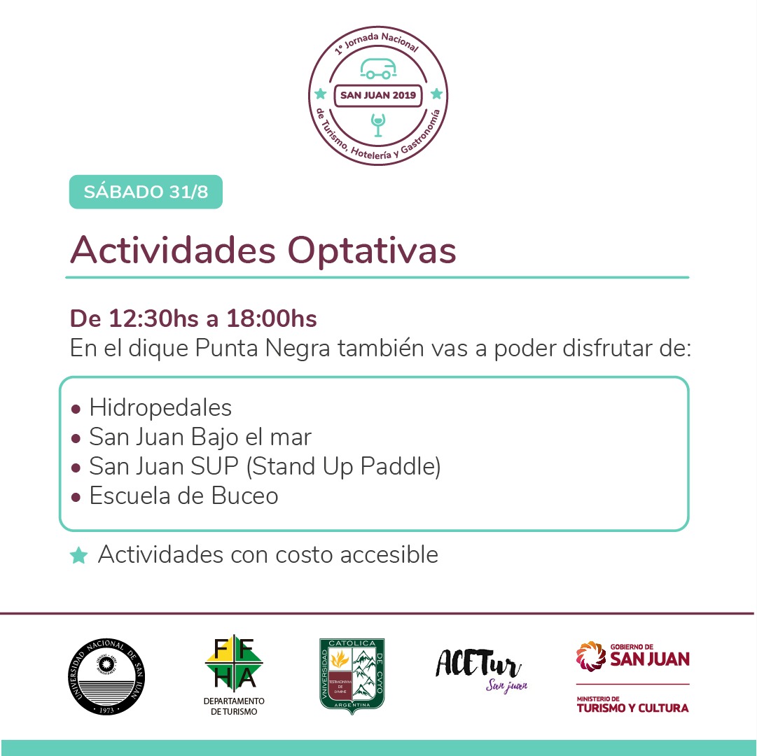 Durante la segunda jornada, en la mañana, los asistentes tendrán la posibilidad de ser parte del Programa Conociendo San Juan del Ministerio de Turismo y Cultura de la provincia, a través del cual visitarán el Teatro del Bicentenario, los Museos de Ciencias Naturales y de Bellas Artes, el Auditorio Juan Victoria, la Casa Natal de Sarmiento, la Catedral y el Mercado Artesanal Tradicional Luisa Escudero.