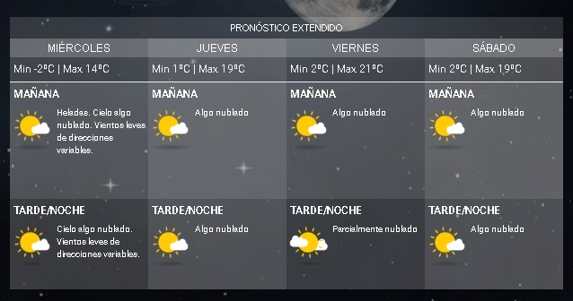 Para el jueves, viernes y sábado, las mínimas oscilarán entre 1 y 2 grados pero las máximas irán en ascenso de 19 a 21 grados. Por lo que pronostican días más agradables pese al frío.