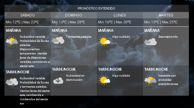 La jornada se presentará con nubosidad variable, probabilidad de lluvias aisladas, vientos leves de direcciones variables, cambiando al sector este y rotando por la tarde-noche al sector sur.