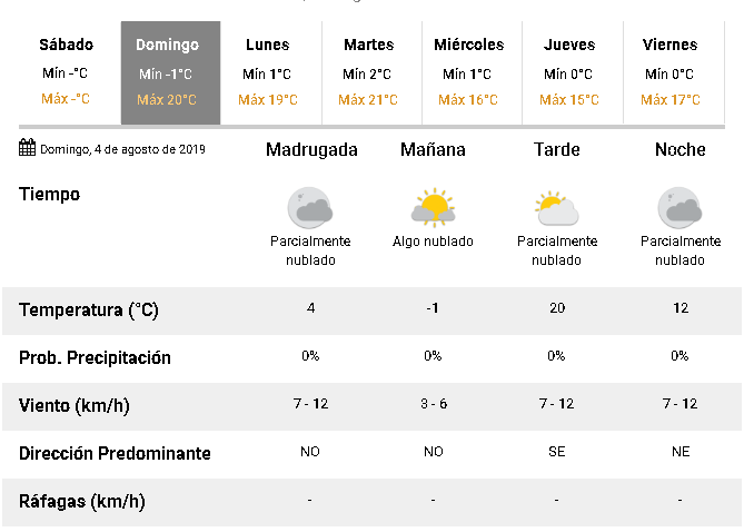 El domingo será una jornada ideal para disfrutar de actividades bajo el sol. Según lo que informa el Servicio Meteorológico Nacional, se espera que la máxima llegue hasta los 20ºC y la mínima caiga hasta -1ºC.