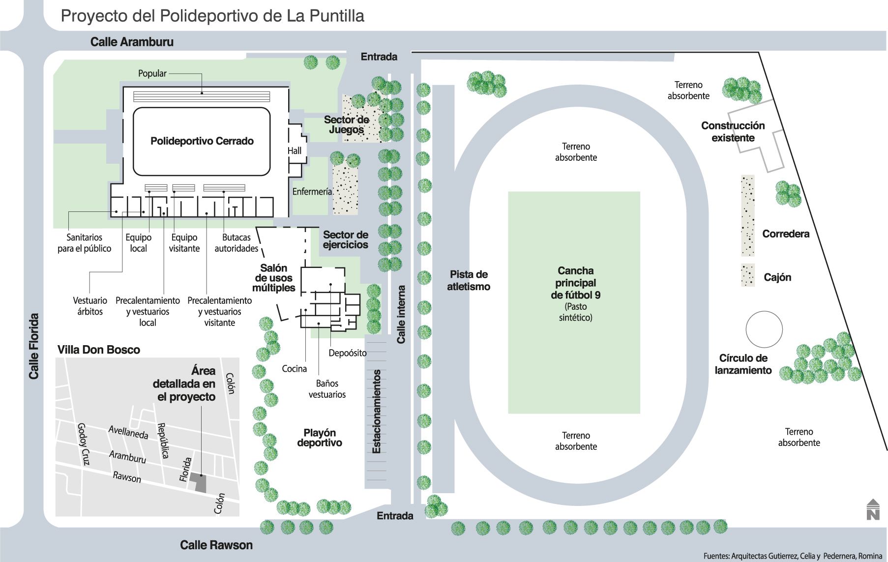 “Estará en La Puntilla porque allí tenemos el polideportivo municipal y vamos a aprovechar ese predio”, dijo el intendente Cristian Andino. La idea es armar el nuevo edificio conservando construcciones ya existentes en el predio en el que en la actualidad hay algunos playones deportivos. El estadio estará en esta localidad porque además es el distrito de San Martín que concentra la mayor cantidad de población.