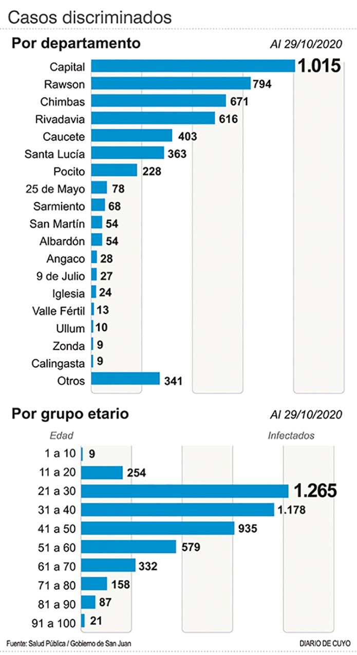En la variación de acumulados en las últimas dos semanas, en Rawson los casos crecieron 23 veces y en Chimbas el salto fue de 31 veces. Rivadavia fue el que más impacto tuvo en 14 días, pues de 10 positivos que reportó el 16 de octubre pasó a 429 el día 29.