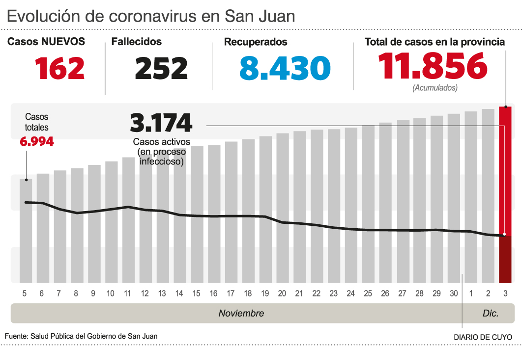 Ahora bien, en los datos plenos, la curva de contagios tiende a mostrar una meseta y de hecho los casos diarios muestran una reducción notoria con respecto a los reportados en las últimas semanas de octubre y en las primeras de noviembre. Es decir que, a priori, San Juan parece haber alcanzado ya su pico, de sostenerse esta tendencia a la baja.
