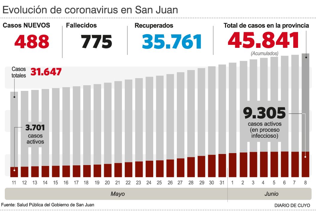 Con el aumento en la cantidad de test tras el fin de semana, aumentaron nuevamente los casos de covid. De acuerdo a Salud Pública, ayer fueron detectados 488 nuevos infectados y de esta manera el acumulado ahora es de 45.841 personas. A su vez, fueron reportados cinco muertes: se trata de cinco hombres de 57 a 74 años, por lo cual el total de fallecidos en pandemia asciende a 775.