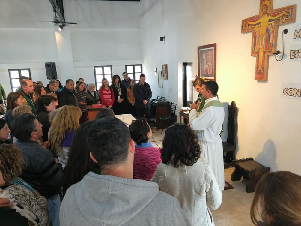 Contención espiritual. Las familias de adictos que llegan a la Comunidad Fuego en busca de ayuda participan el primer viernes de cada mes en una celebración eucarística en la parroquia de Villa San Damián, Rawson.