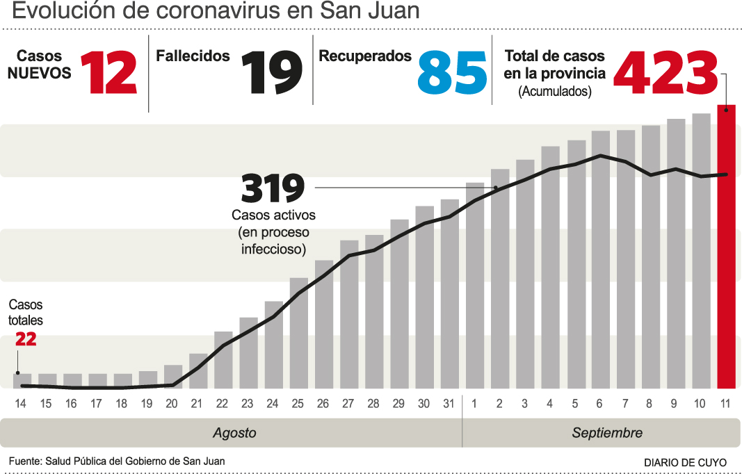 Con nueve muertes en tres días, los decesos por coronavirus en San Juan van en aumento y en contraposición continúa bajando la edad promedio de los fallecidos. En la jornada de ayer murieron tres personas y el total se eleva ahora a 19 sanjuaninos, con una edad promedio de 79 años. Precisamente, sigue bajando la media en la edad de los decesos, pues hace 10 días era de 88 años. Por su parte, el Ministerio de Salud Pública reportó 12 casos nuevos de coronavirus, por lo que la provincia acumula ahora 423.