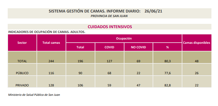 Además, se encuentran internados 238 pacientes en las áreas de COVID-19 (entre positivos y sospechosos) de los hospitales Dr. Guillermo Rawson; Dr. Marcial Quiroga; Dr. Ventura Lloveras, de Sarmiento; Dr. César Aguilar, de Caucete; Dr. José Giordano, de Albardón; Dr. Federico Cantoni, de Pocito; CEMEC; Dra. Julieta Lanteri; Hospital San Roque, de Jáchal; Hospital Dr. Alejandro Albarracín, de Valle Fértil; Hospital de Barreal, de Calingasta; Hospital Privado; Instituto Médico; Clínica El Castaño; Clínica Santa Clara; Sanatorio San Juan y CCI.