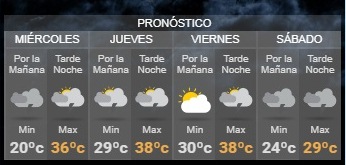Mientras que, por la tarde, el cielo continuará parcialmente nublado, con probabilidad de lluvias y tormentas aisladas, algunas fuertes hacia la noche y vientos moderados o regulares del sector norte. La temperatura máxima alcanzará los 36 grados.