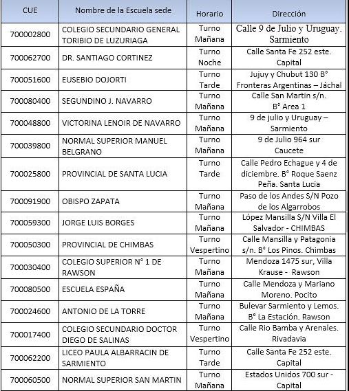 Los interesados, deberán concurrir desde el día 28 de junio al 1 de julio con la documentación requerida por las escuelas sede que abajo se detallan: