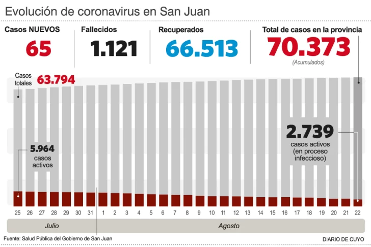 El Ministerio de Salud Pública de la provincia informó ayer que se reportaron 3 muertes por covid-19 y 65 nuevos contagios. Se trata de víctimas jóvenes, todas estaban internadas en camas del Hospital Guillermo Rawson: un hombre de 54 años, de Pocito; un hombre de 46 años, de Pocito; y otro hombre de 46 años, oriundo de Chimbas, precisaron.