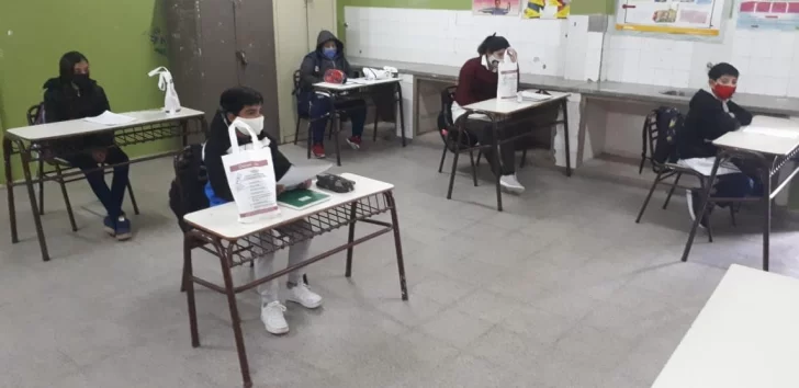 Con alcohol en gel distribuido en los distintos salones y galerías, los chicos entraron ataviados con sus guardapolvos y uniformes, que no usaban desde marzo pasado, y ocuparon los bancos, que ya habían sido colocados estratégicamente distanciados para evitar el contacto estrecho.