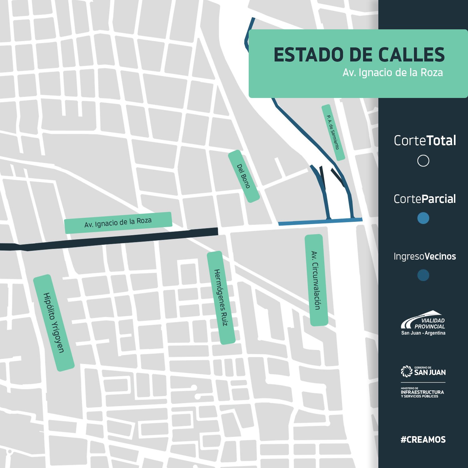Con motivo de la obra de ensanche de la Avenida Ignacio de la Roza, a partir de mañana 29 de marzo se realizará un corte de media calzada en el tramo comprendido entre Paula Albarracín de Sarmiento y Del Bono.