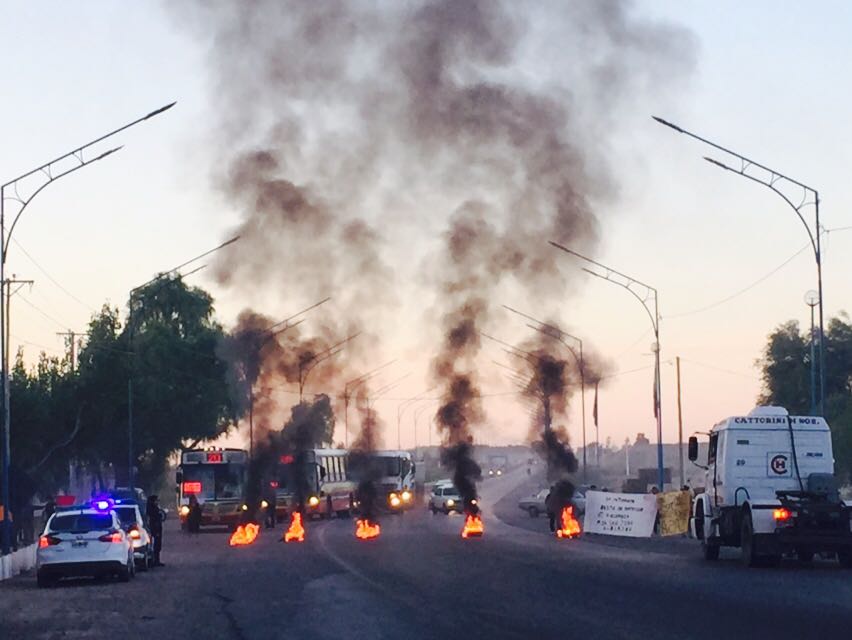 Con quema de gomas y carteles, los manifestantes en un primer momento limitaban el paso de los vehículos. Más tarde la presencia policial logró que uno de los carriles fuera liberado.