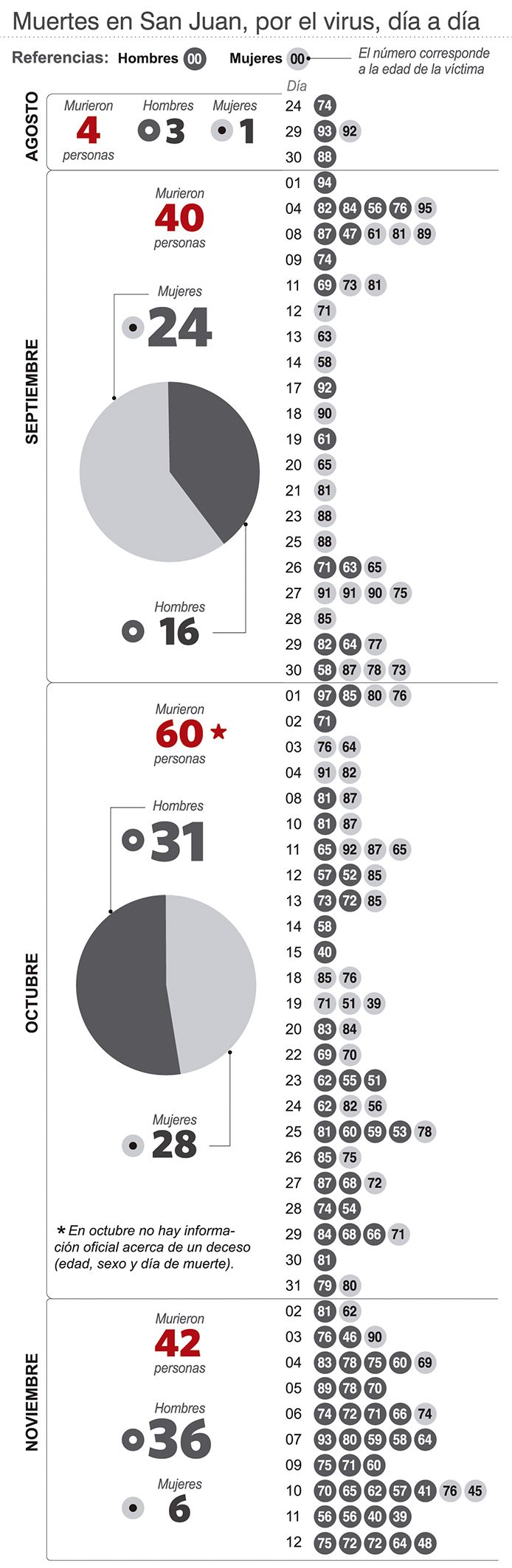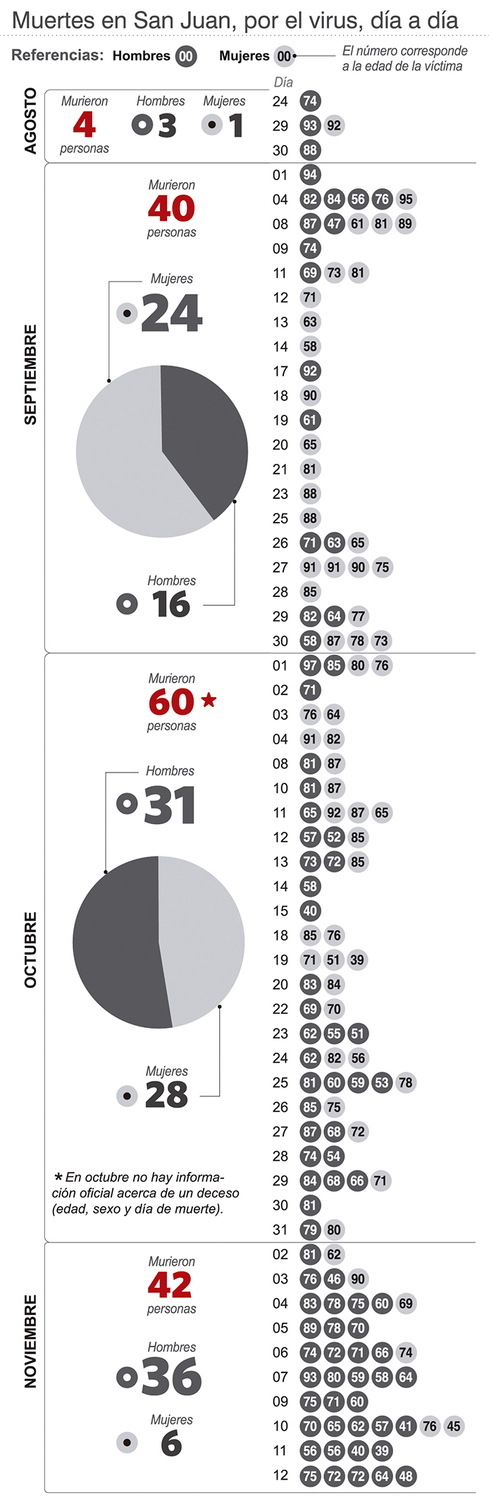 Precisamente, en cuanto a la edad media de todos los fallecidos acumulados hasta ahora es de 72,1 años. Y en la progresión mensual, en cuatro meses bajó nada menos que 14 años. Sucede que en el puñado de decesos que hubo en agosto, el promedio de edad fue de 86,3. En septiembre (40 muertes), pasó a 76,4; en octubre (60 fallecidos, pero uno sin información sobre edad, sexo, procedencia o fecha y lugar de muerte) descendió a 72 años; mientras que en los 12 días de noviembre, la media de edad de fallecidos es de 66,6 años.