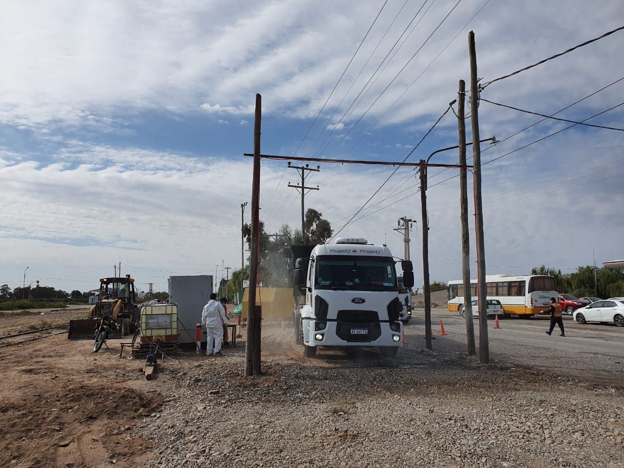 El municipio, junto con un privado, colocó el arco de desinfección en la intersección de Ruta 153 y Ruta 40 donde se rocía la parte inferior, ambos laterales y superior de los camiones con solución clorada.