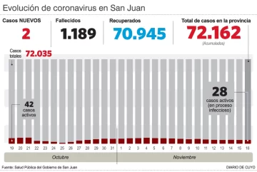 De acuerdo a lo informado anoche por Salud Pública, en la jornada de ayer fueron registrados sólo 2 casos nuevos de covid, en tanto que no se reportó ningún fallecimiento por esa causa. De este modo, los contagios acumulados en San Juan desde el inicio de la pandemia ya son 72.162, de los cuales 70.945 son personas que ya se recuperaron. Por otro lado, las muertes en total siguen siendo 1.189. Además, según el reporte oficial, hasta anoche había 24 pacientes internados en áreas Covid de toda la provincia, 10 de los cuales permanecían en Área Crítica (4 de ellos recibían asistencia respiratoria).