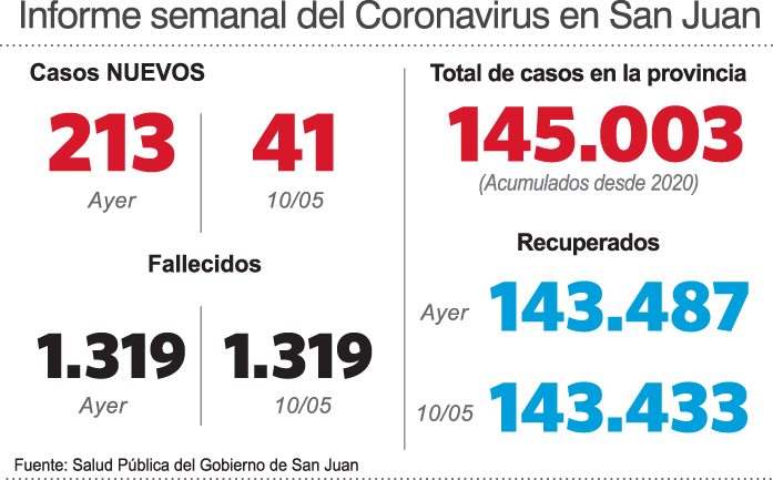 De 41 a 213 casos nuevos en una semana, el aumento en los casos de covid fue superior al 400% y de esta manera San Juan no escapa al brote que hay en el país, declarado como el inicio de la cuarta ola de contagios. De acuerdo al reporte que emitió ayer el Ministerio de Salud Pública hubo un fuerte crecimiento en la cantidad de personas infectadas y por eso insistieron en sostener las medidas preventivas, además de completar los esquemas de vacunación. Pero al mismo tiempo, aclararon que por ahora no evalúan aplicar medidas restrictivas.