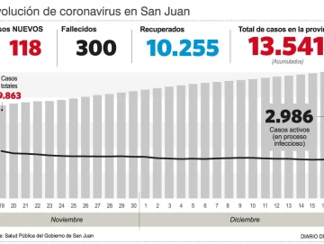 Con tres nuevos decesos, San Juan llegó ayer a los 300 fallecidos a causa de Covid, de acuerdo a lo que informó el Ministerio de Salud Publica. Además, reportaron 118 casos y los contagios ascienden a 13.541.