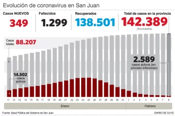 Según el parte de coronavirus que entregó el Gobierno provincial ayer, en San Juan se registraron 349 casos positivos y un fallecimiento. Además, se observó una baja en la cantidad de internados: de 73 que habían hasta el lunes, ayer se comunicaron 57. De ese total, 21 pacientes permanecen internados en el área crítica, 4 de los cuales reciben asistencia respiratoria mecánica. Entre los internados en el área covid-19, no hay embarazadas ni pacientes pediátricos.