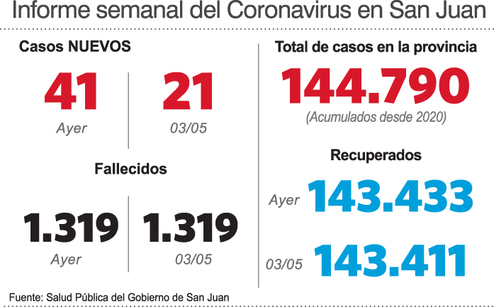 Según el último parte oficial de covid, que fue publicado ayer por el Ministerio de Salud, en la semana epidemiológica número 18, en San Juan se detectaron 41 casos. Este informe indicó además que hasta ayer había sólo un paciente internado en Área Covid y que en esa semana no hubo fallecidos, ni pacientes con asistencia respiratoria mecánica.