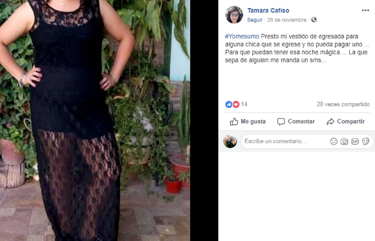 Hace unos días algunos medios nacionales comenzaron a hablar sobre el préstamo de vestidos para las egresadas a través de las redes sociales. Con el hashtag #yomesumo las sanjuaninas también se unieron a esta tendencia. Muchas de ellas comentaron que lo hicieron debido a que la crisis económica llegó a muchos bolsillos y porque son conscientes que comprar la ropa para un baile de egresados es muy costoso. "Tengo mi vestido impecable y no lo usé más. Me pareció muy bueno que alguien pueda utilizarlo. La única condición que pongo es que lo cuiden y lo devuelvan en condiciones. En pocos días me llamaron varias chicas para consultar si era verdad", dijo Sol Luque, una de las jóvenes de la provincia que publicó en Facebook su ofrecimiento. Al igual que ellas, otras chicas comentaron que leyeron sobre esta tendencia a través de las redes y decidieron copiar esta forma de ayudar.