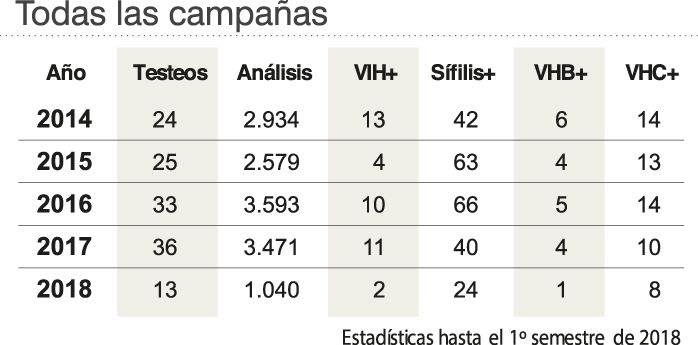 Por eso para ellos no es lo más importante que entre los 262 análisis del año pasado se detectara un caso de VIH y 6 de sífilis y que entre las 424 de ahora, se realizara una segunda prueba con 6 casos de Hepatitis C, 14 de sífilis y otros 2 de VIH.