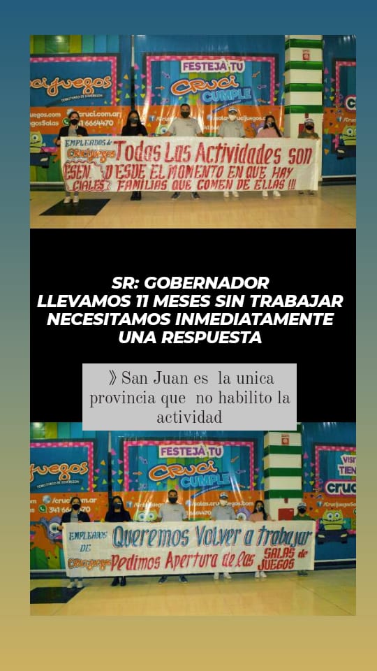 Los trabajadores de las tres salas de entretenimiento infantil formaron un grupo para manifestarse y solicitar el regreso de su actividad, que en otras provincias, se encuentra habilitada desde hace tiempo. “Los Crucijuegos de Santa Fe, Chaco, Corrientes, Córdoba, Tucumán, Santiago del Estero, Posadas y Formosa están abiertos. El Neverland de Mendoza también está funcionando y los Playland de otras provincias ya están trabajando”, comentó Montiveros.