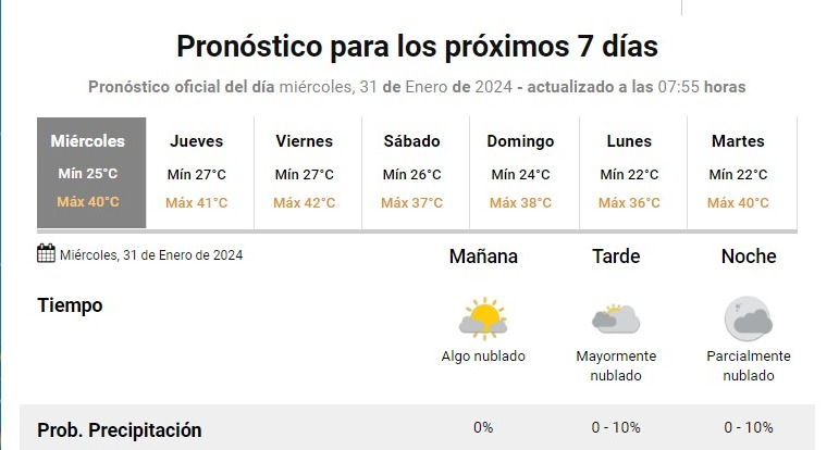 El profesional afirmó que hasta entonces seguirán las máximas superiores a los 40 grados, tal es el caso de este jueves y viernes, días en los que se espera llegue a los 41 y 42 grados, respectivamente.