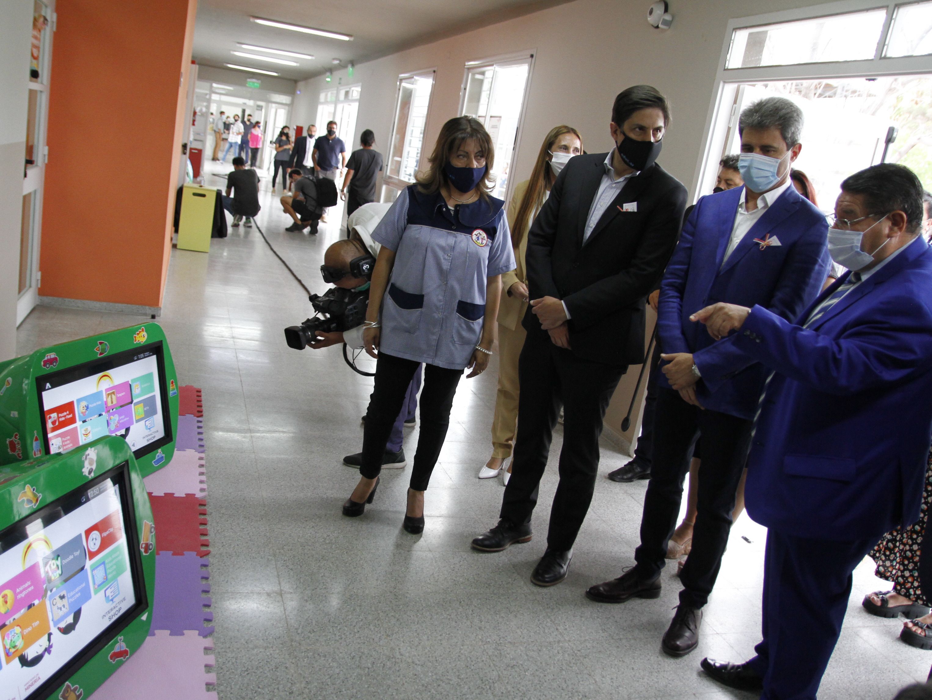 RECORRIDA. El ministro Nicolás Trotta y el gobernador Sergio Uñac recorrieron las instalaciones de la ENI 35 y se detuvieron en las mesas digitales.