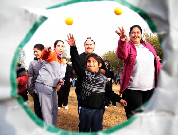 Tras un baile que puso a todos en estado, los chicos con discapacidades visuales, mentales y motrices de las escuelas Luis Braille, Fortabat, Merceditas y del Centro de Día Nuestra Señora de la Paz, fueron invitados a recorrer los 4 juegos dispuestos para ellos. La gran mayoría eligió el primer juego e hizo cola para esperar su turno. El objetivo era embocar una pelota en huecos realizados sobre una lona que estaba colgada de un arco. La actividad merecía destreza, pero también actitud. Por eso, el que tiraba varias veces sin suerte se adelantaba hasta quedar muy cerca de los agujeros para pasar la pelota hacia el otro lado. Nadie se quejaba por eso, ni ponía objeciones. Es más, todos aplaudían al competidor sin importar si acertaba en el blanco o no. Lo mismo sucedía al lado, donde los chicos debían lanzar un aro y embocarlo en conos naranja, y en algunos casos recibían ayuda extra de los profesores.