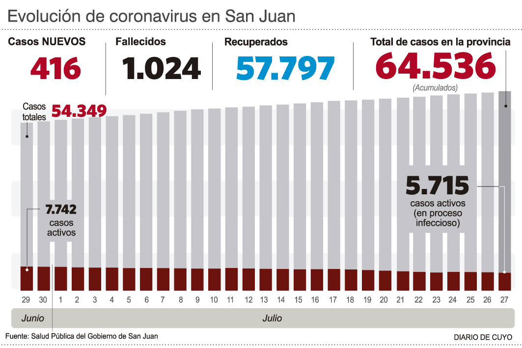 A su vez, hay 416 nuevos casos y por lo tanto el acumulado ahora es de 64.536 infectados. De ellos, hay 5.715 casos activos y quienes requieren de internación son 203 pacientes, de los cuales 103 están en terapia intensiva.