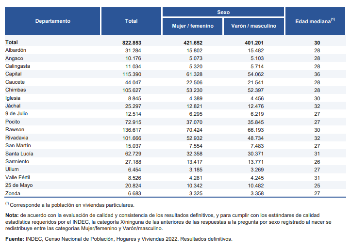 El INDEC publicó nuevos datos del ‘Censo Nacional de Población, Hogares y Viviendas 2022’, con 45.892.285 habitantes en Argentina y 822.853, en San Juan. También difundió datos a la población en cada uno de los 19 departamentos sanjuaninos, estando Ullum en un extremo (con 6.454 habitantes) y Rawson, en el otro (con 136.617).