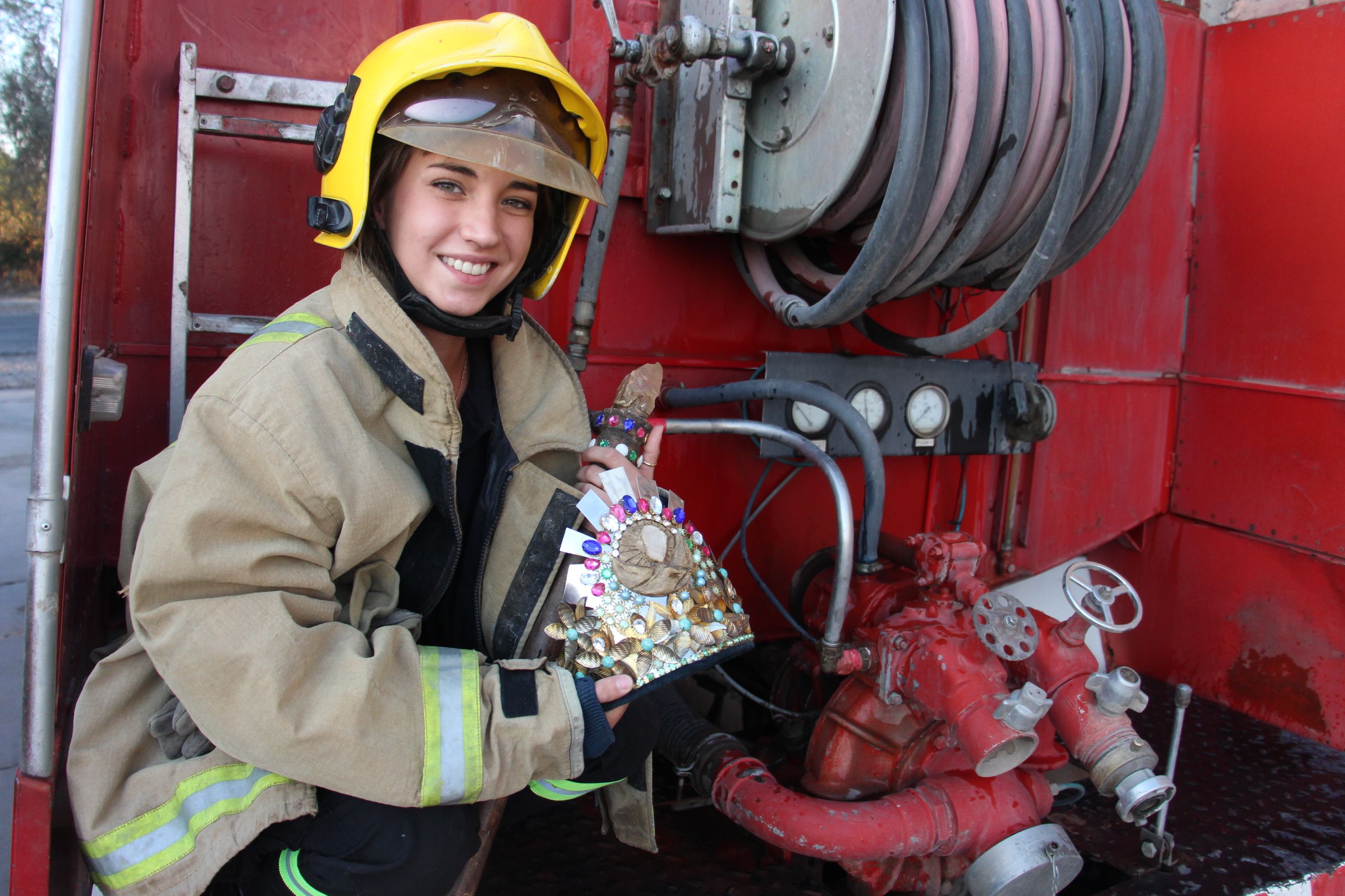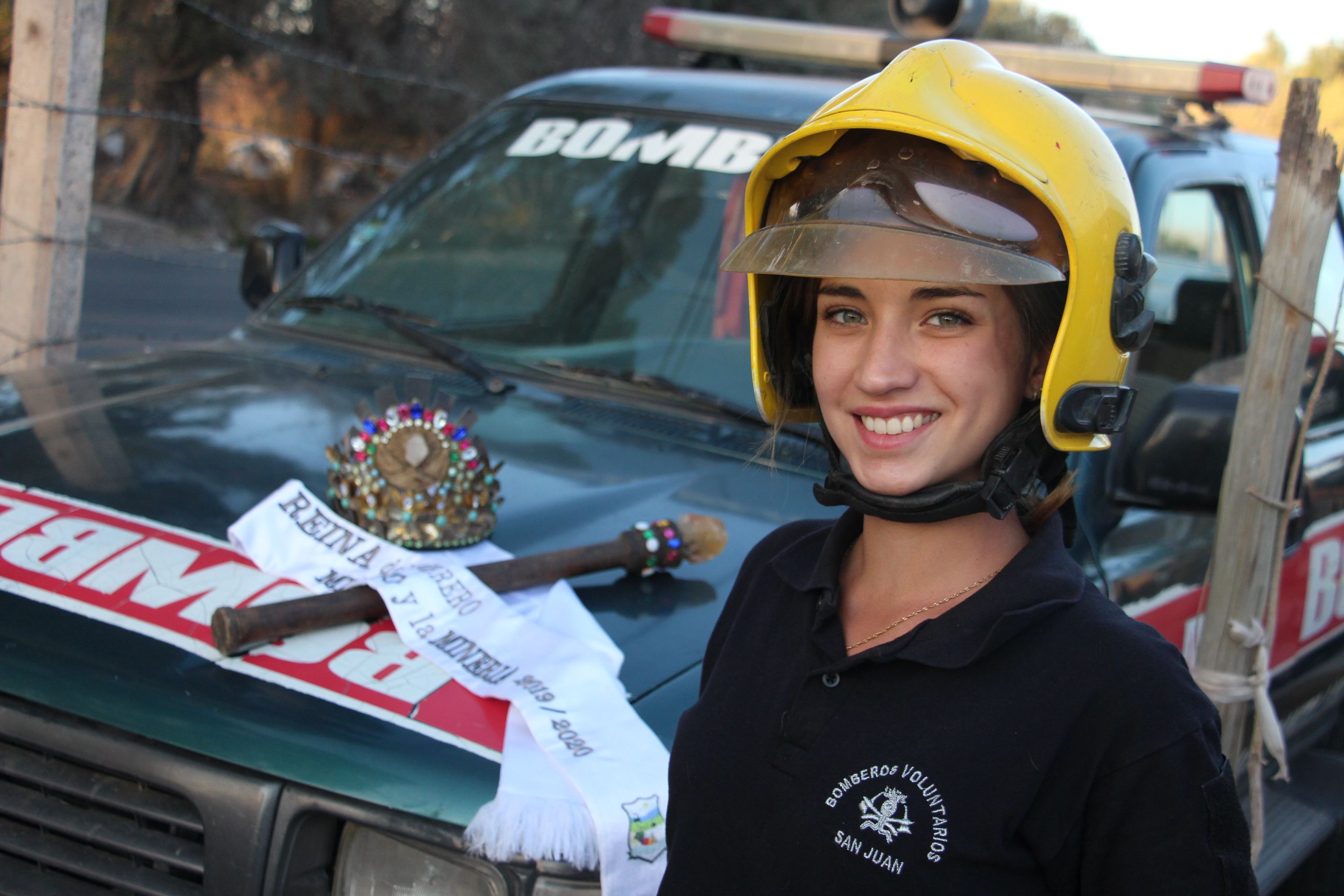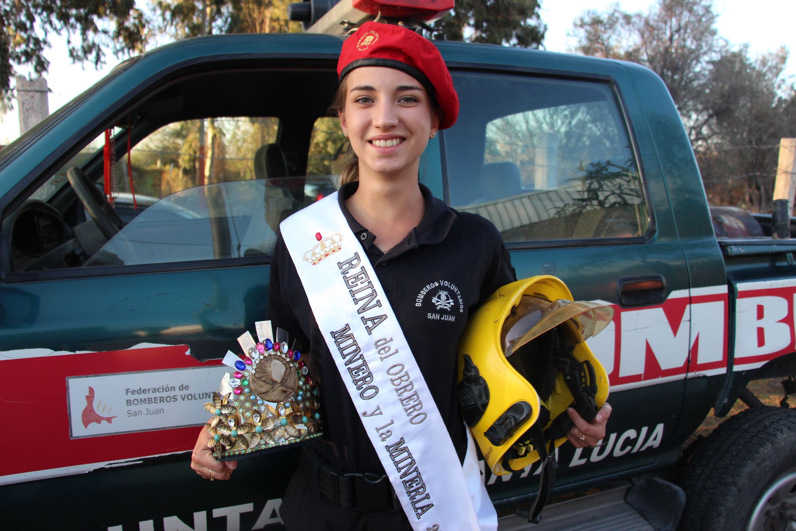 La protagonista de esta historia es Melanie Rondano Giménez (20), actual Reina del Obrero Minero y la Minería, que hace tres meses se sumó al Cuartel de Bomberos Voluntarios de Santa Lucía, formando un combo poco corriente.
